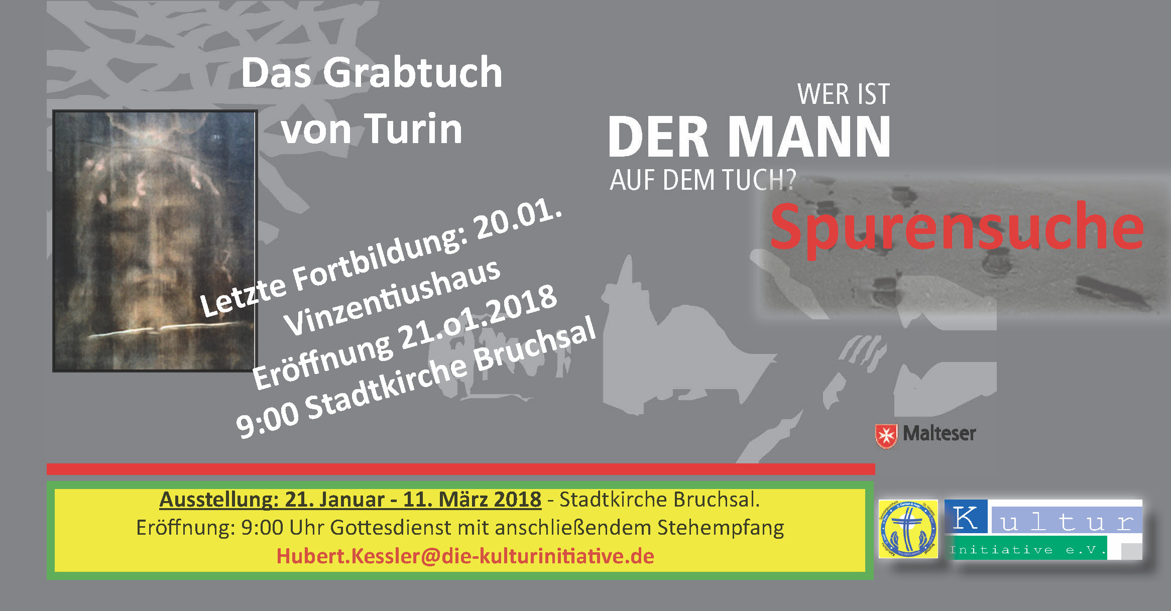 Nach Weihnachten werden hier die offiziellen Führungstermine veröffentlicht. Grundsätzlich ist die Ausstellung immer zugänglich zu den Öffnungszeiten der Kirche (außerhalb der Gottesdienstzeiten) Schulklassen und Gruppenanfrage richten Sie bitte an -> TurinerGrabtuchBruchsal@die-Kulturinitiative.de Anbei Informationen zur Ausstellung: