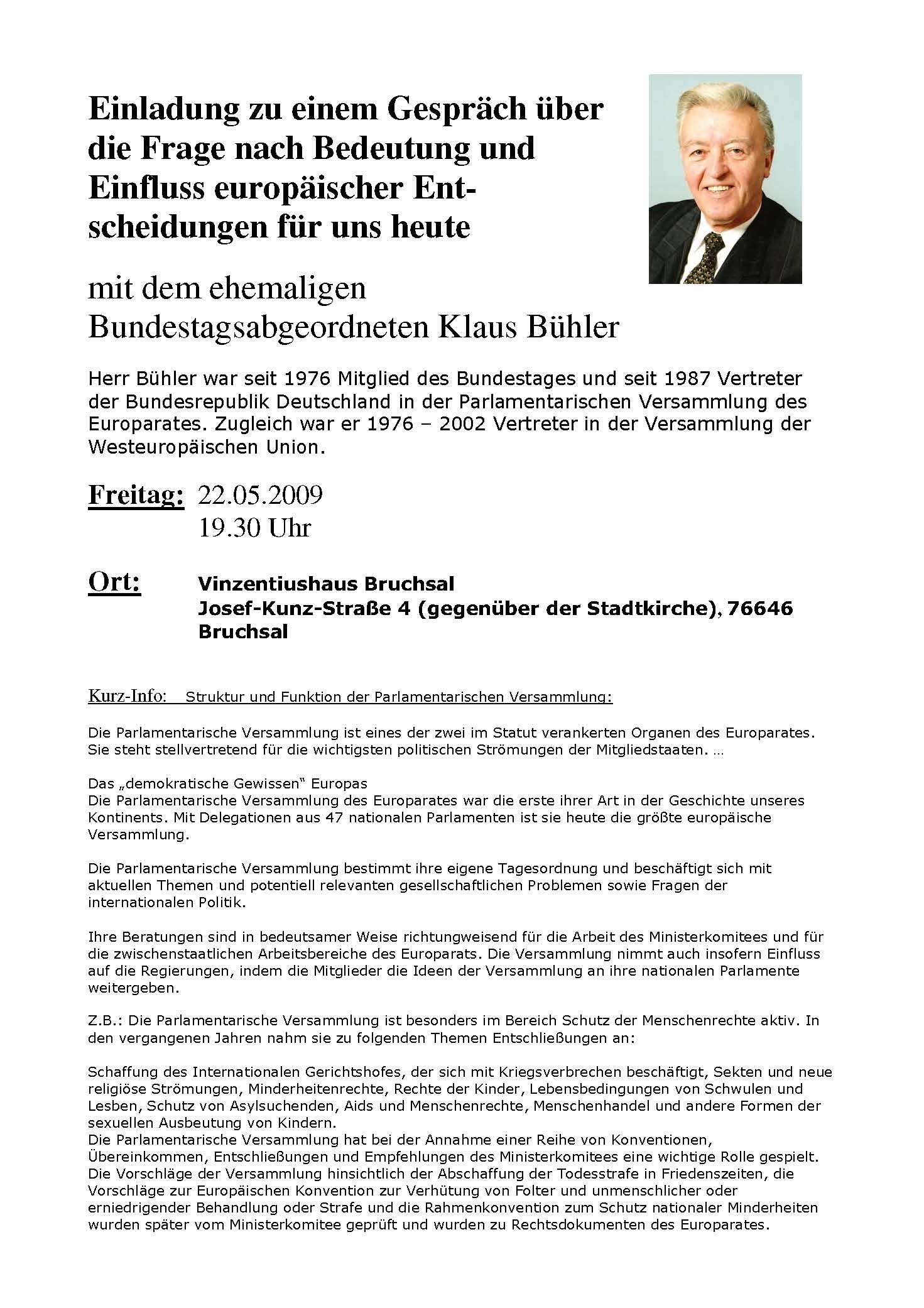 Begegnung mit MDB Klaus Bühler Von Hubert Keßler Freitag, 22. Mai 2009 Gespräch mit dem ehemaligen Bundestagsabgeordneten Klaus Bühler über die Bedeutung europäischer Entscheidungen.