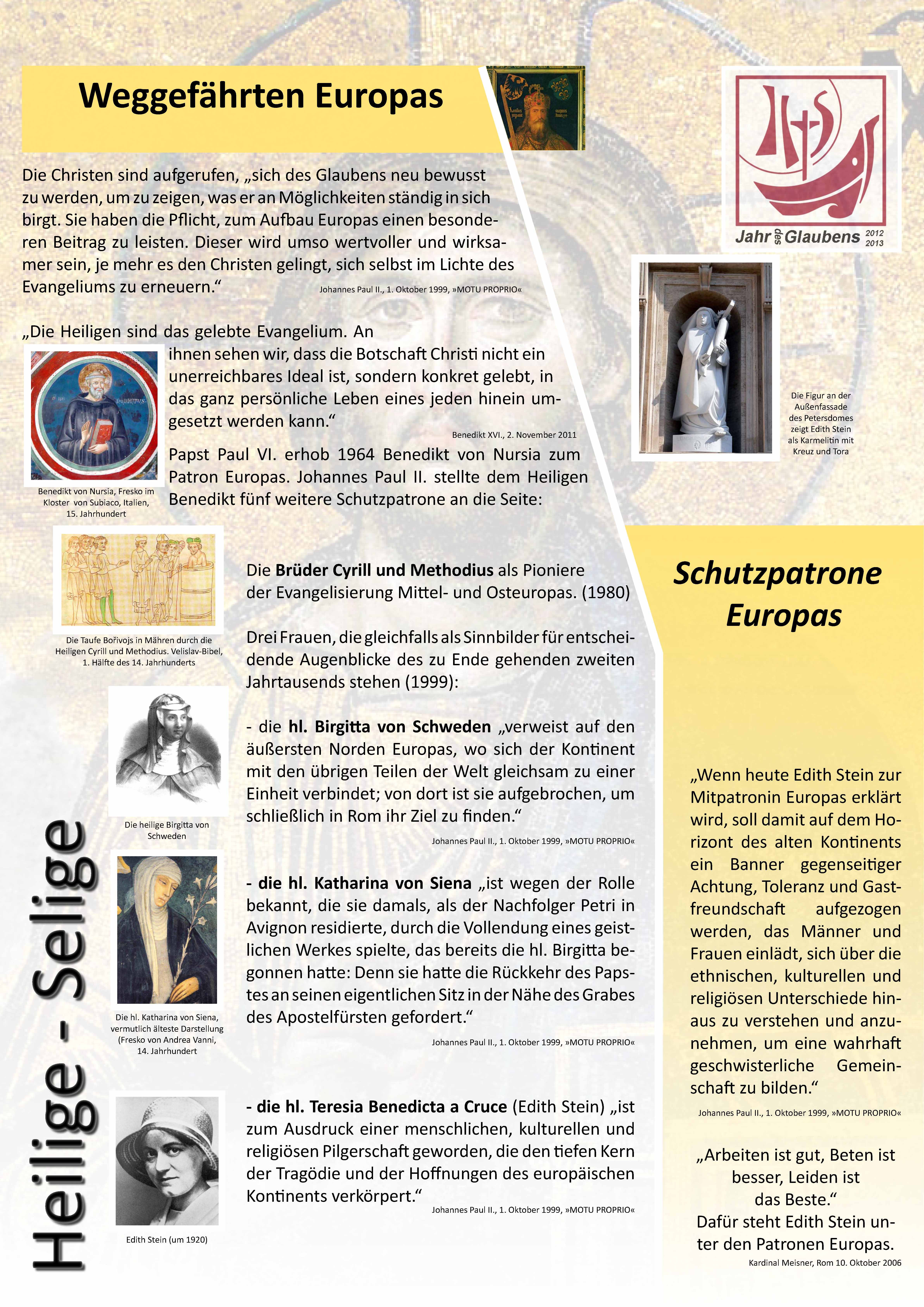 Diese begleitende Ausstellung erinnert zunächst an die Patrone Europas, allen voran an den heiligen Benedikt. Ein Zeugnis dafür, dass das „ quaerere Deum“ (Gott suchen) eine kulturelle Fruchtbarkeit entfaltete, die zum nährenden Boden des heutigen Europas wurde. Wenn die Heiligen Cyrill, Methodius und Birgitta von Schweden an die räumliche Ausdehnung der Evangelisierung Europas erinnern, so die heilige Theresa Benedicta a Cruce (Edith Stein) an die versöhnende Kraft des Glaubens auf dem Hintergrund der schrecklichsten Tragödie dieses Kontinents im letzten Jahrhundert. Sie entdeckte durch den christlichen Glauben den Zugang zu ihrer jüdischen Tradition. „Sie hat begriffen, wie viel es ihr bedeutet, ´Tochter des auserwählten Volkes zu sein, nicht nur geistig, sondern auch blutsmäßig zu Christus zu gehören.`“ Mit der Ernennung all dieser Heiligen zu Patronen Europas machte Papst Johannes Paul II. darauf aufmerksam, dass Europa eine Seele braucht, um seinen geis-tigen Zusammenhalt zu garantieren.