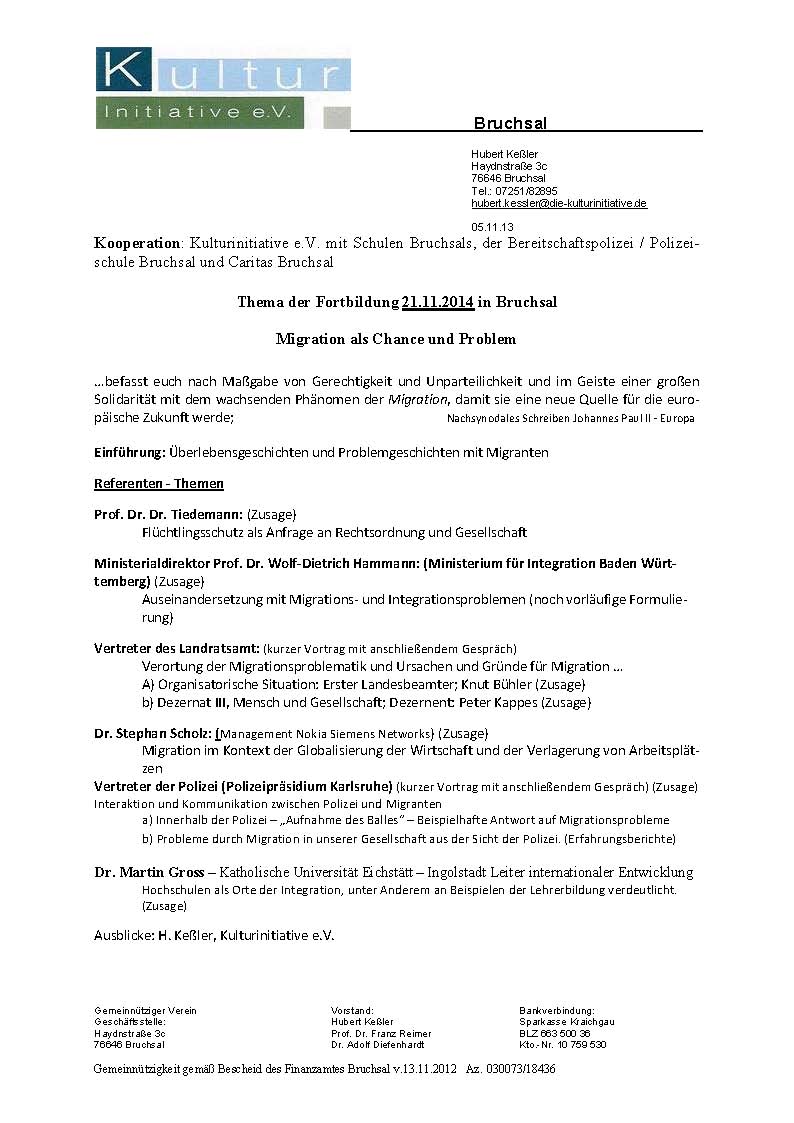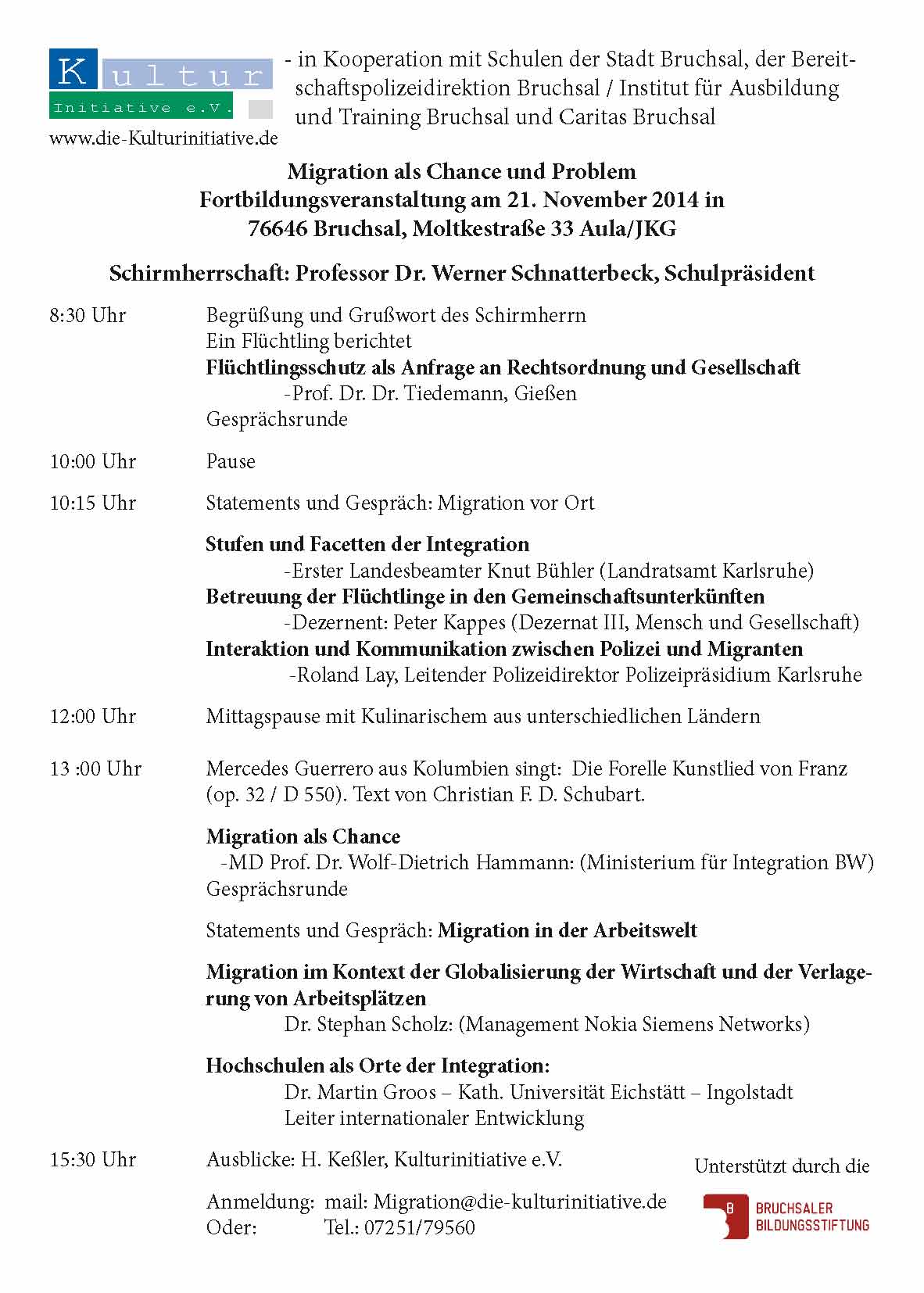 Ein lebendiger Dialog und eine informative Auseinandersetzung bei der Tagung „Sie suchen eine Heimat - Migration als Chance und Problem“, welche Kulturinitiative e.V. in Bruchsal in Kooperation mit hiesigen Schulen, Caritas und der Bereitschafts-polizeidirektion Bruchsal / Institut für Ausbildung und Training am vergangenen Freitag, 21.11.2014 in der Aula des Justus-Knecht-Gymnasiums veranstaltete.