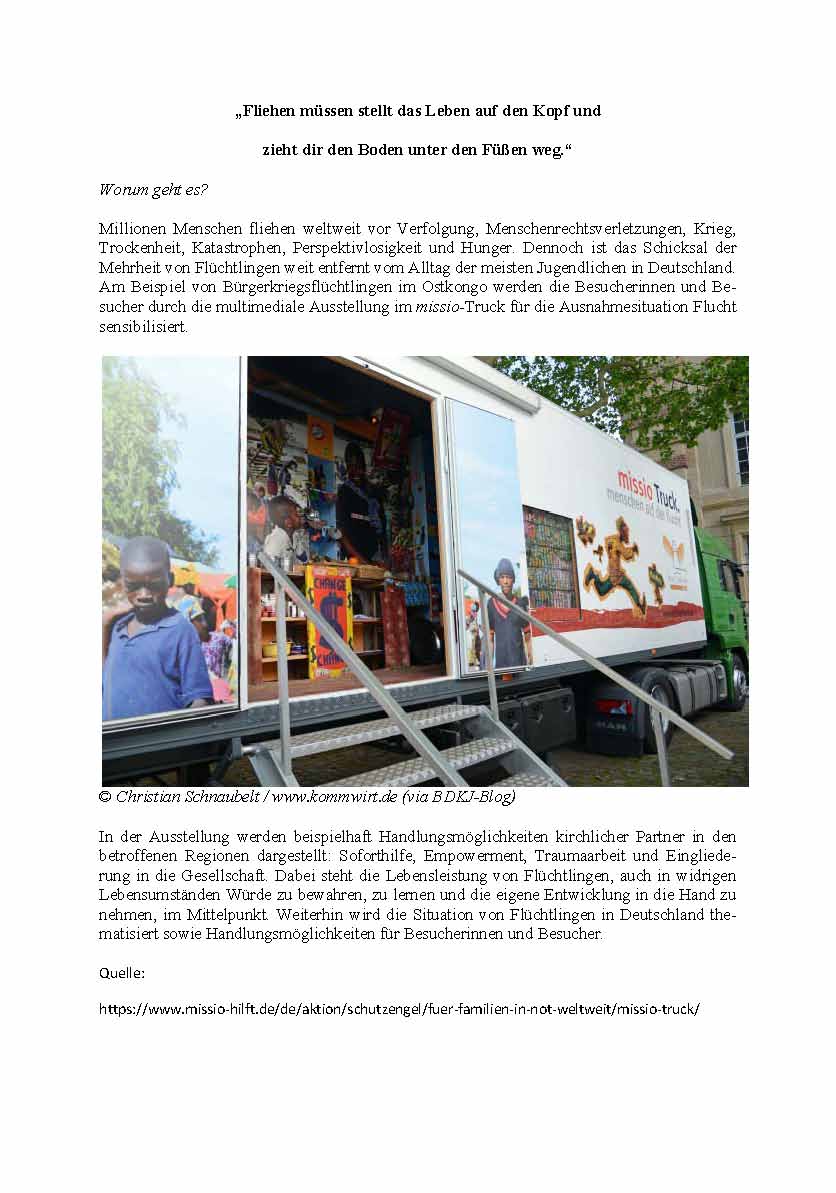 Von Montag den 1. Dez. – Freitag 5.Dez. stand der Flucht-Truck von missio-Aachen im Justus-Knecht-Gymnasium und im