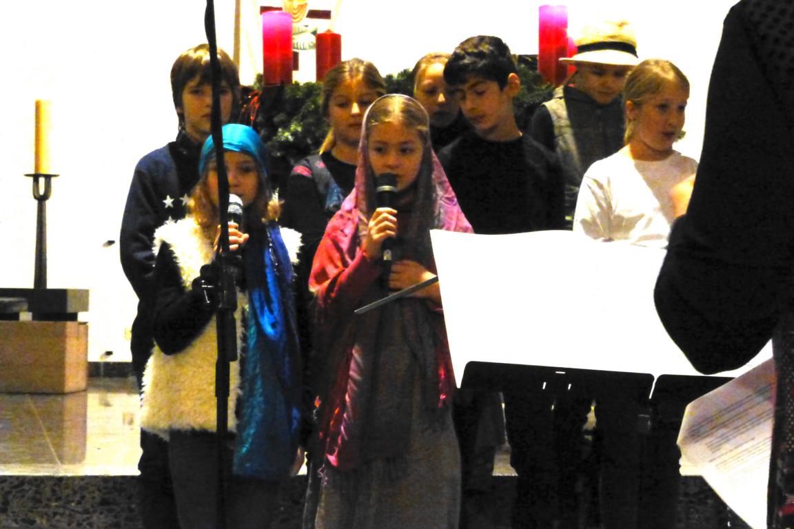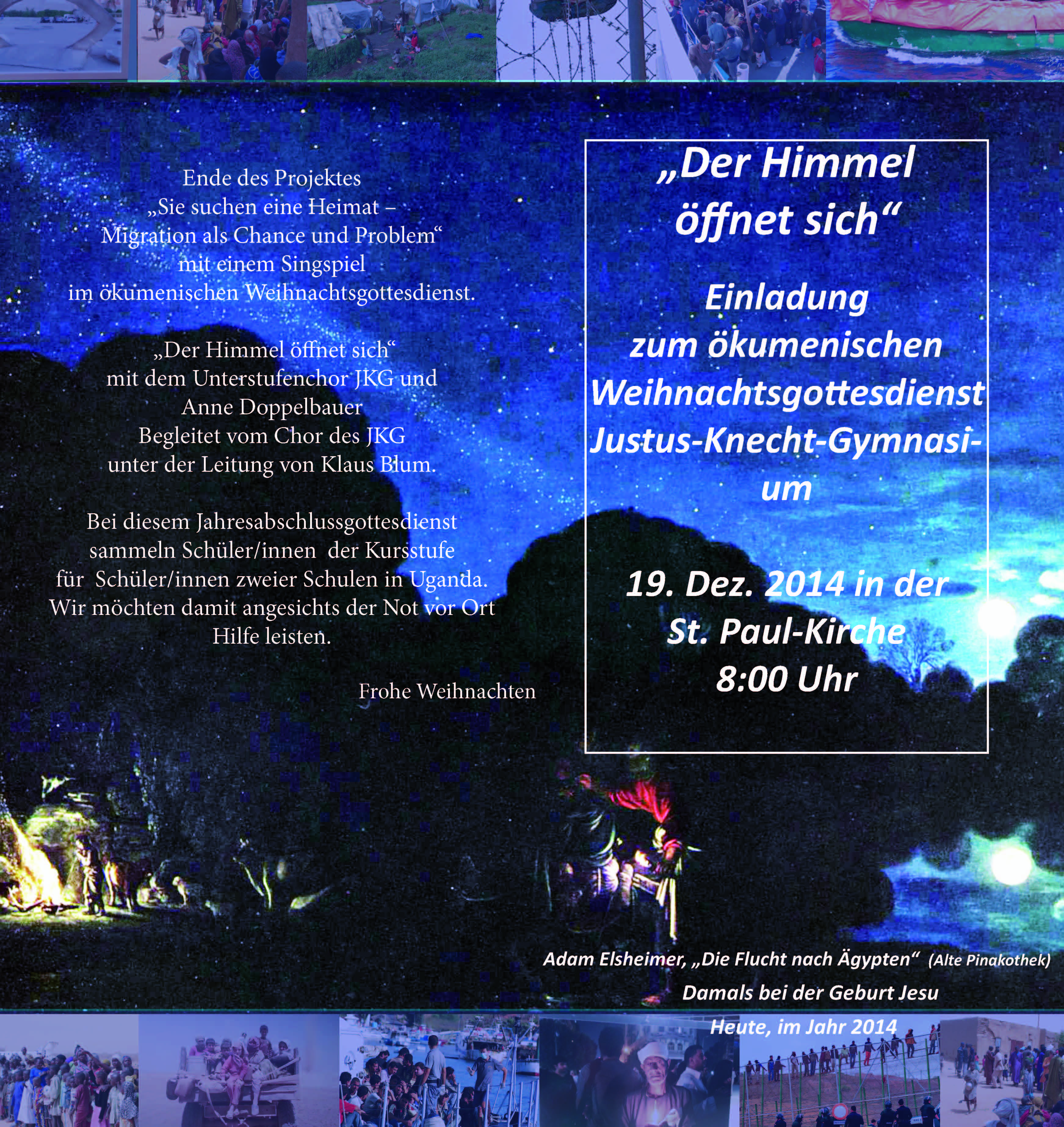 Eine voll besetzte Kirche, Schüler/innen, Lehrer/innen und Eltern des JKG folgten mit großer Aufmerksamkeit den Aufführungen, Worten und Lieder beim Abschlussgottesdienst im JKG. Kulturinitiative e.V. beendete das Projekt „Sie suchen eine Heimat – Migration als Chance und Problem“ bei diesem ökumenischen Weihnachtsgottesdienst. Die Musiklehrerin Anne Doppelbauer führte mit ihren neun jungen Talenten des Unterstufenchores ein Weihnachtssingspiel auf, das die „Migrations- und Flucht-Geschichte“ von Jesus und Maria parallelisierte mit dem Schicksal der 50 Millionen Flüchtlingen weltweit.(PDF - weiterlesen)