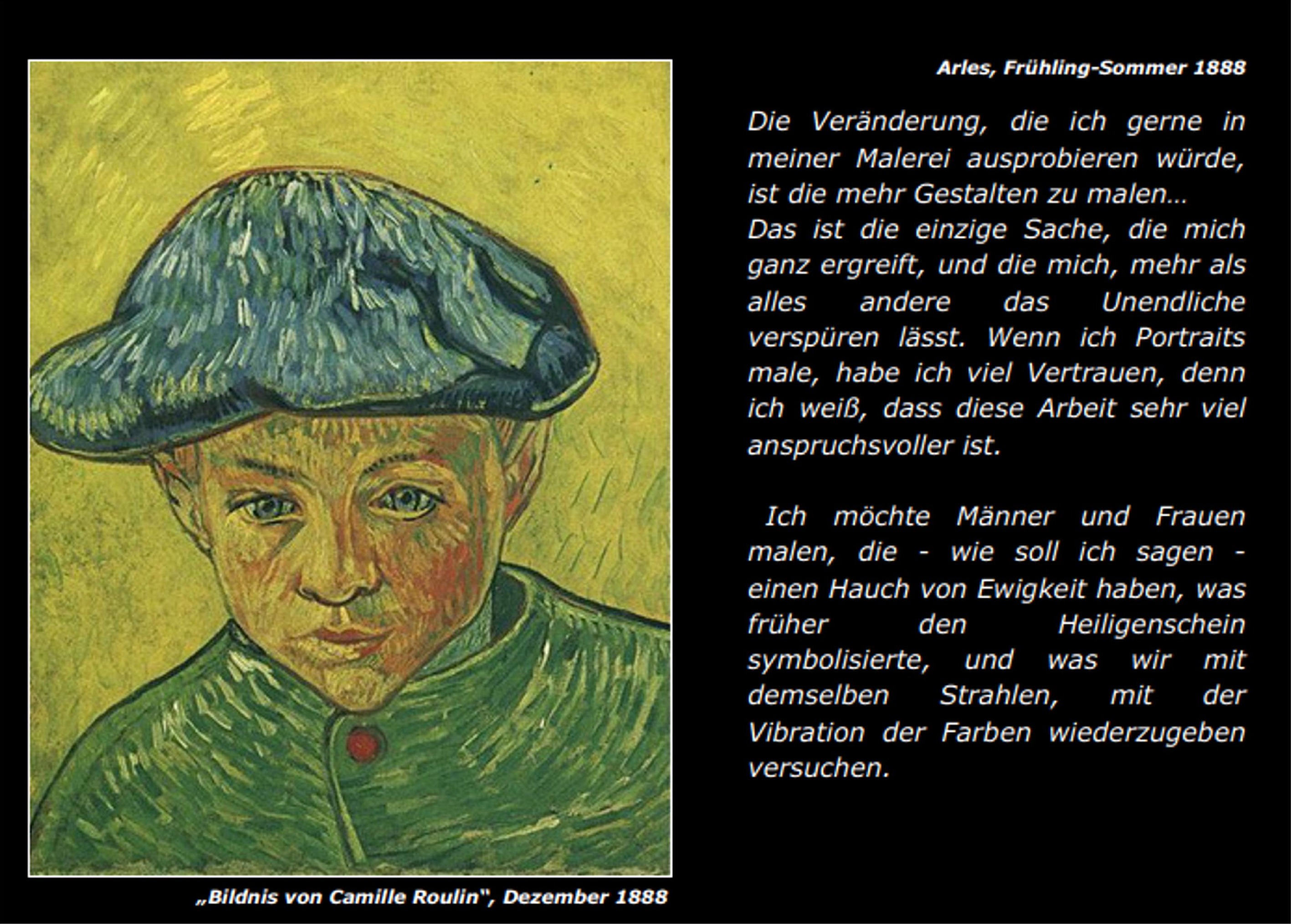 schreibt er aus Arles Theo als Anmerkung zum Bildnis Camille Roulin im Jahre 1888: „Das ist die einzige Sache, die mich