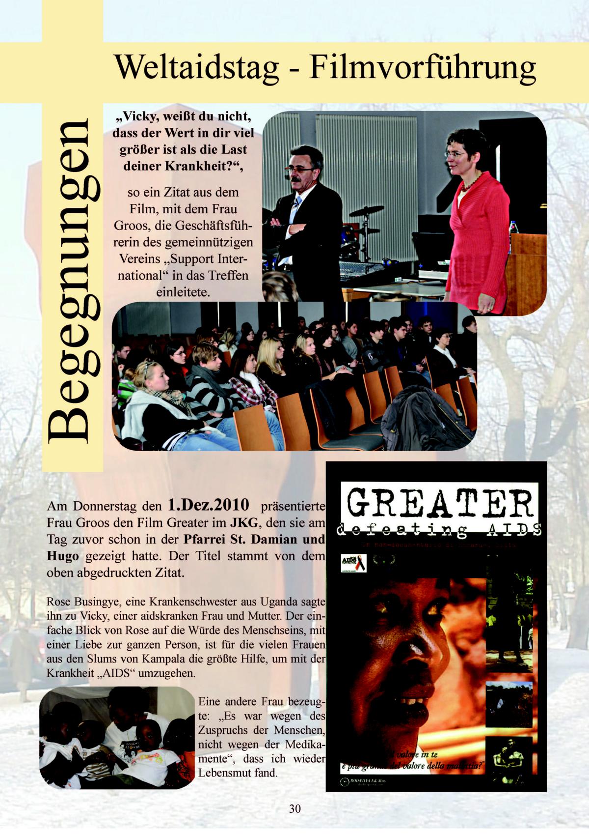 Am Donnerstag nach dem Weltaidstag am 2. Dezember wird in der Schule JKG in der 6-7 Std. dieser Film gezeigt und anschließend wird Frau Groos von Support International e.V. über die Aidsproblematik in Afrika sprechen. Sie begleitet unter anderem seit vielen Jahren eine Gruppe von aidskranken Frauen, die sich um Frau Rose Busingye und dem von dieser gegründeten Meetingpoint zusammen getan haben. Frau Busingye bekam 2003 für ihr Werk den Friedenspreis “Servitor Pacis” (“Diener des Friedens”).